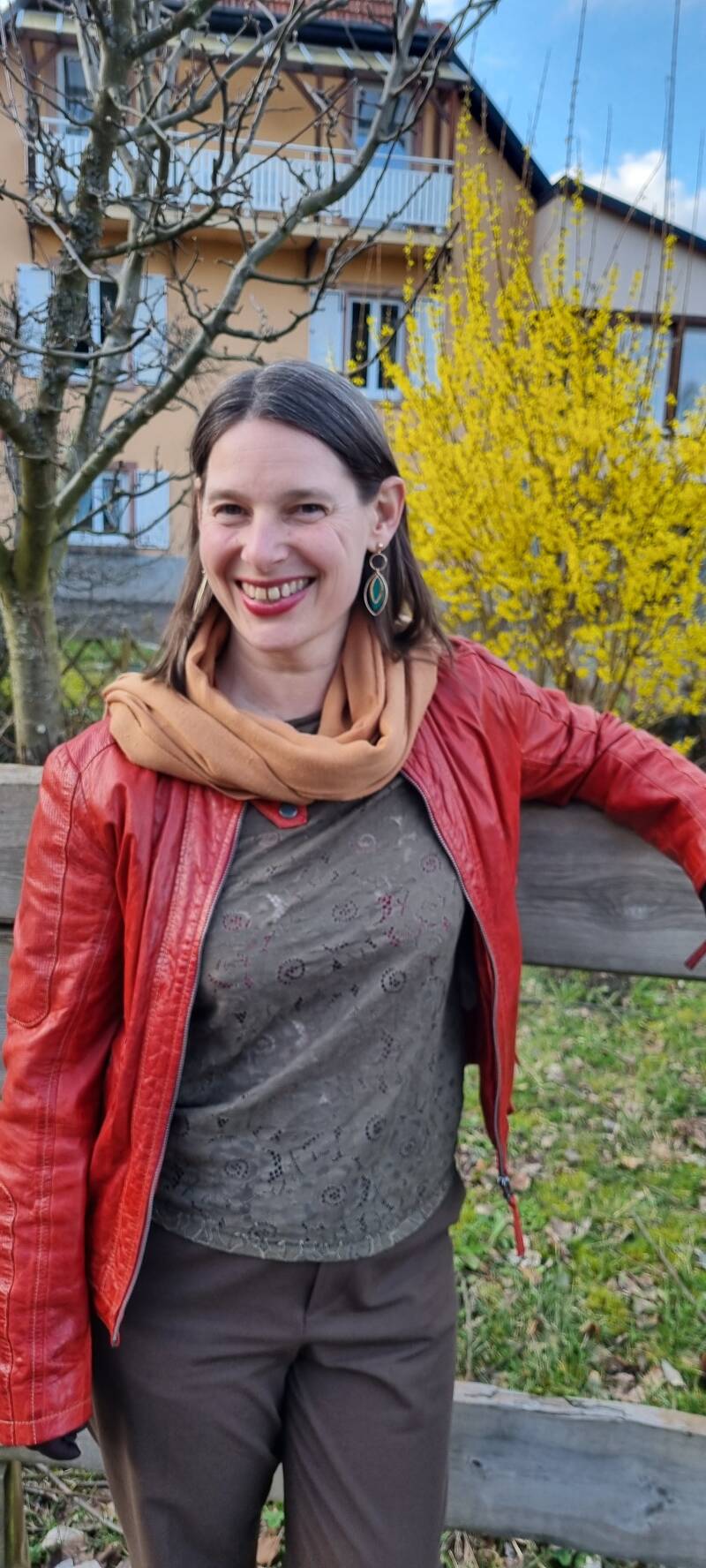 Emilie porte les couleurs de la palette Automne, des couleurs profondes, riches en pigments. Elle dégage naturellement l'accueil et la générosité. Par ailleurs, ayant fait le choix d'un profil complet, elle repart également avec ses matières de prédilection (dentelle, cuir, matières stretch ayant une certaine tenue, pour contenir son énergie plutôt tonique et intense // et pour soutenir sa capacité naturelle à fédérer des gens autour d'elle, elle porte des vêtements rappelant la forme du cercle (dans les boucles d'oreille, le port de l'écharpe...)